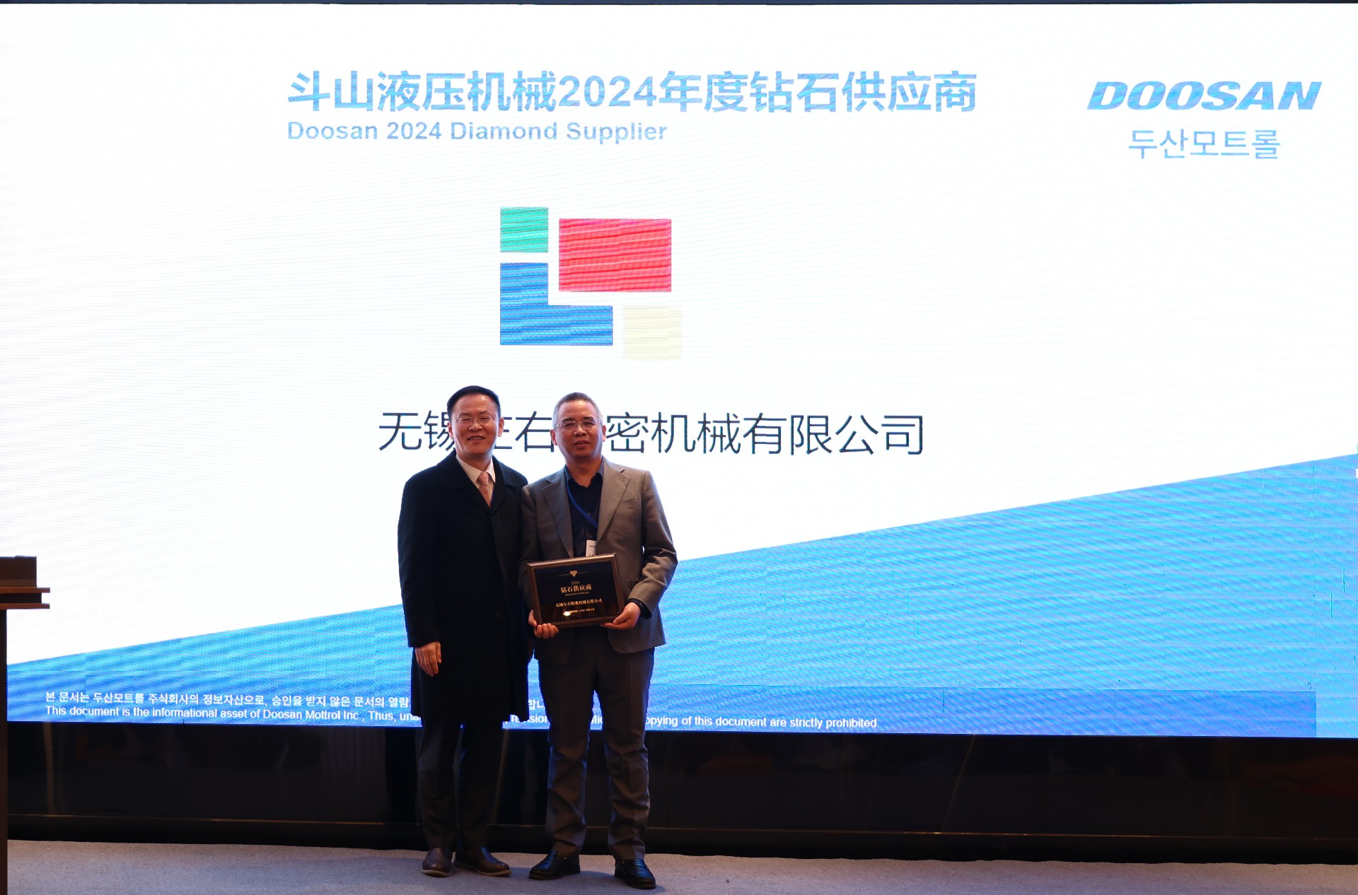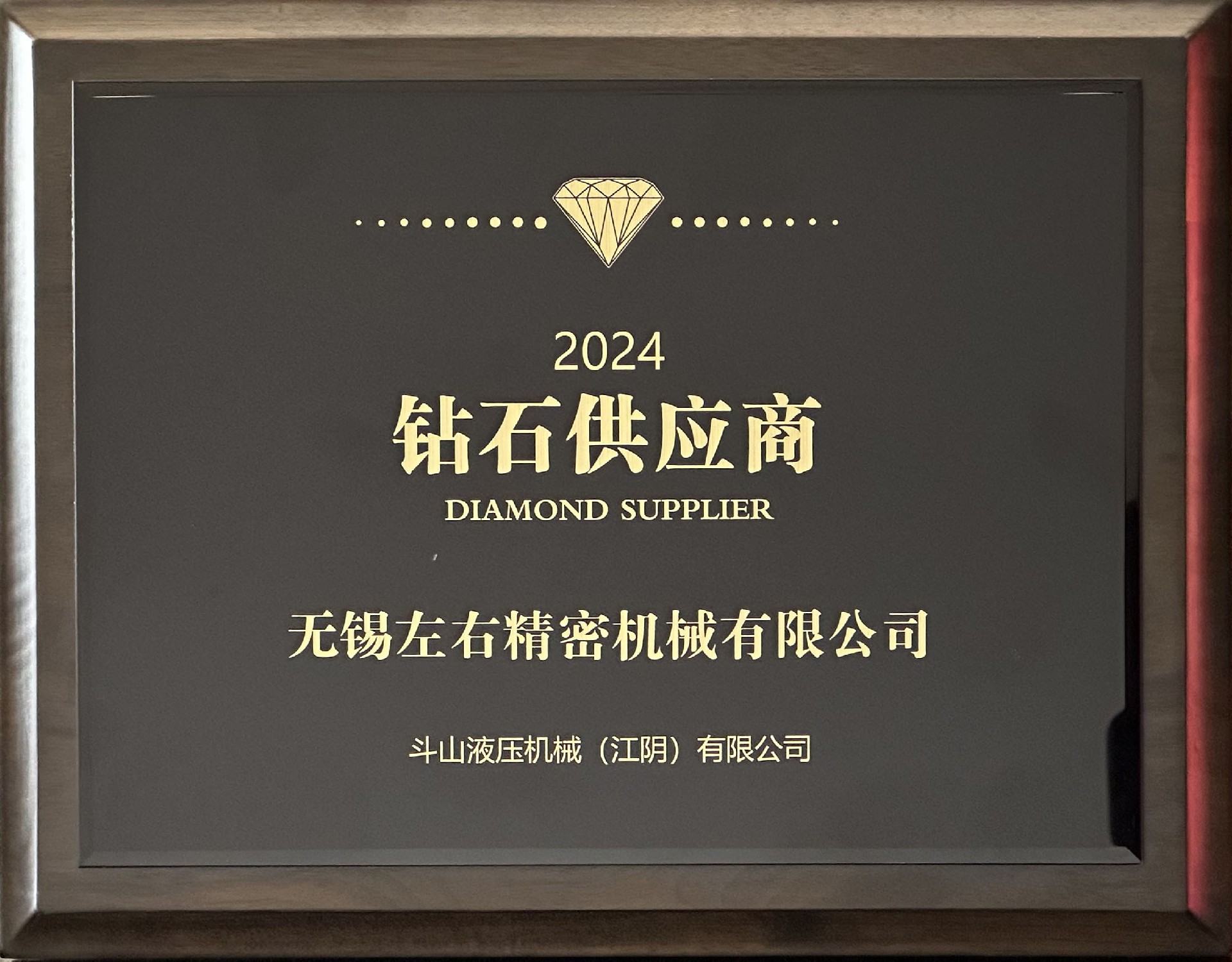 喜報!無錫左右精密機械有限公司榮獲斗山液壓機械(江陰)有限公司“2024年度鉆石供應商”獎項!