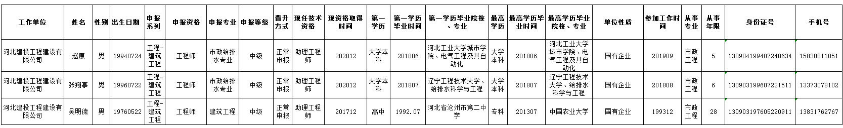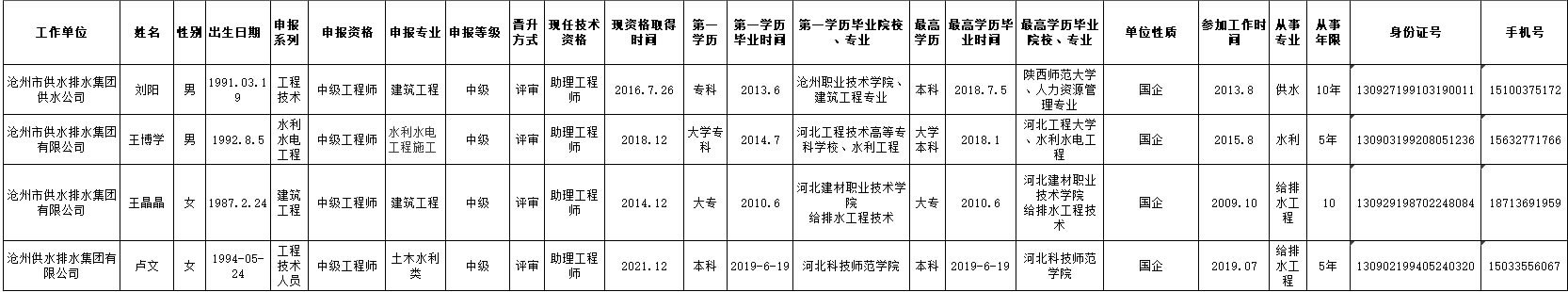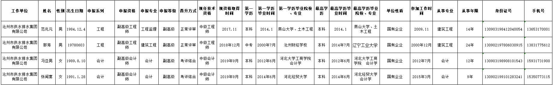 2020年供排水集團申報職稱人員公示表